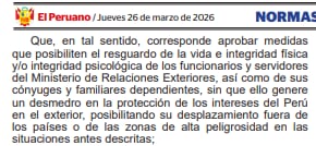A través del Decreto Supremo N.° 016-2026-RE, se establecen lineamientos para proteger a quienes laboran en representaciones del Perú en el extranjero. La norma contempla acciones específicas cuando se presenten escenarios de alta peligrosidad que comprometan la integridad de los trabajadores.